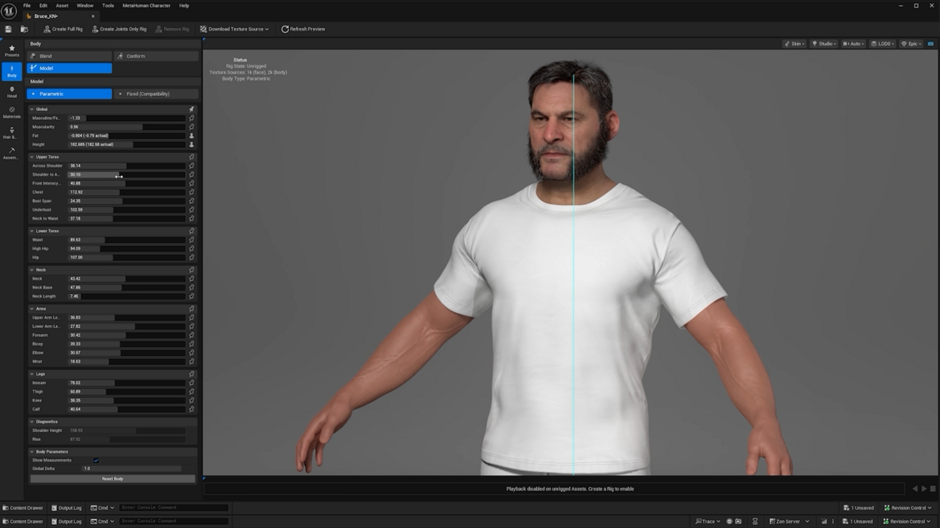 MetaHuman Creator’s highly regarded intuitive face authoring tools have now been extended to bodies. The new parametric body system enables you to easily create a near infinite range of plausible body shapes based on extensive real-world scanned data that you can sculpt and blend between—just as you can for faces.