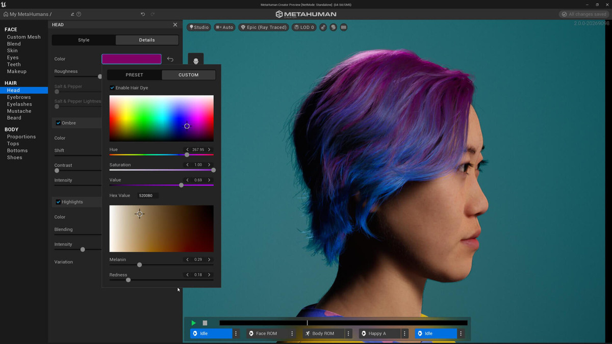 Finally, to give you more control and offer more variety over your characters' hair, we’ve added 13 new hairdos, together with additional styles of beards, mustaches, eyebrows, and eyelashes for a total of 23 new grooms. We’ve also enabled you to further customize their colors, with Ombré and Highlights features, and the ability to separately color different areas of the Mohawk, Faux Mohawk, and Pulled Back styles. Together, these options offer you a whole new range of looks for your MetaHumans.